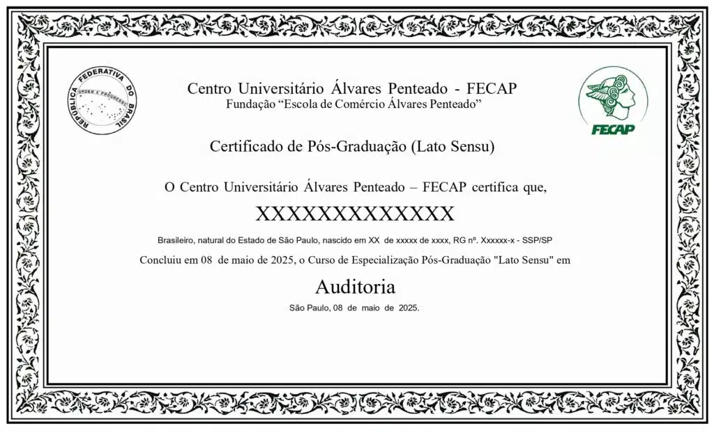 Ao concluir a Pós-Graduação em Auditoria da FECAP, você receberá um certificado de especialização, com validade nacional. Esse documento atesta sua qualificação profissional em uma das áreas mais estratégicas e valorizadas do mercado, reforçando seu currículo com o prestígio de uma instituição com mais de 120 anos de tradição em excelência acadêmica.